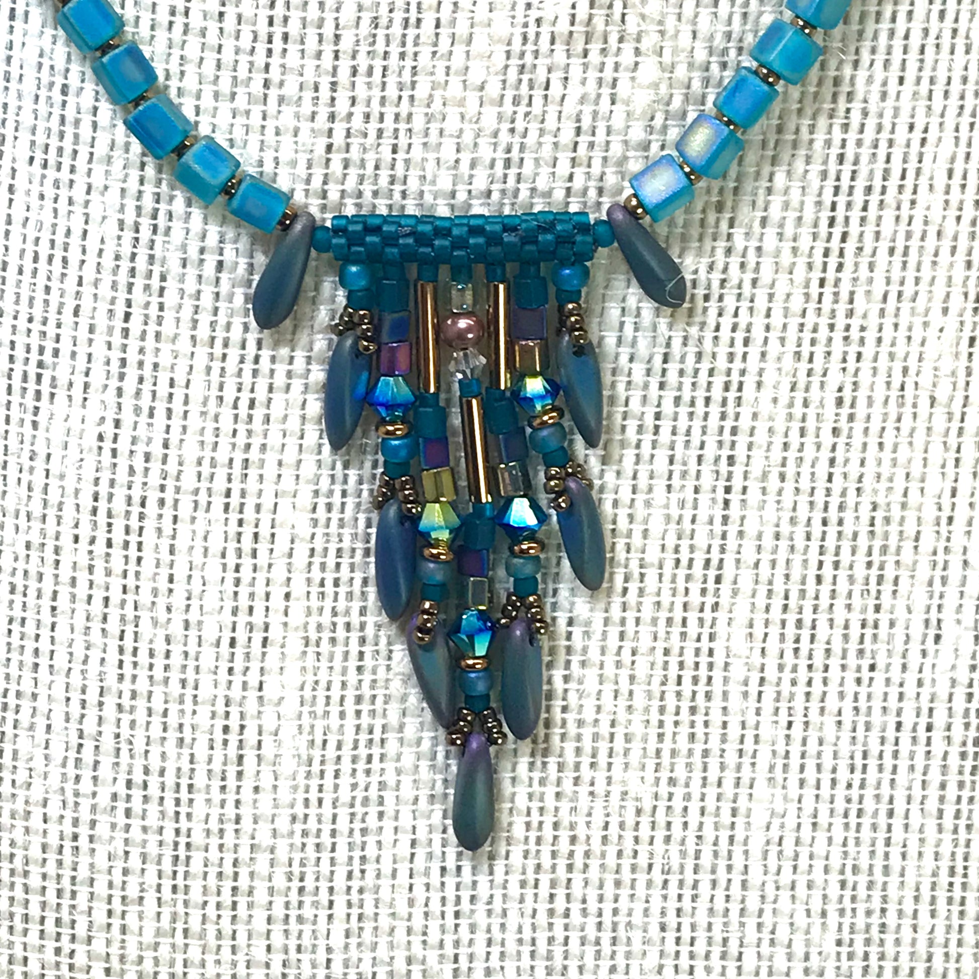 This swingy fringy necklace has the snap and sparkle of Austrian crystals set off next to matte teal Japanese and Czech beads.